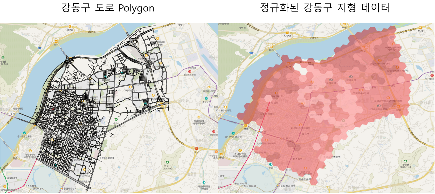 오른쪽은 서울 강동구의 지형 데이터를 Uber H3으로 정규화해 도색화한 형태다.