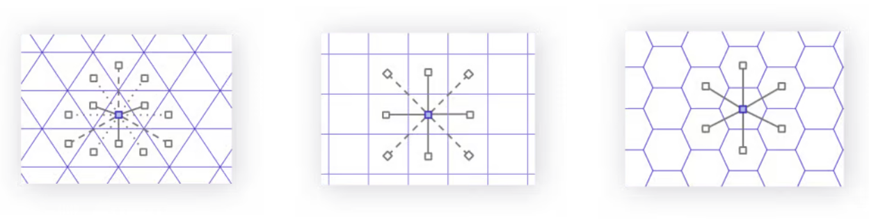 6각형의 경우 6방향만 보면 되기 때문에 적은 비용으로 주변을 탐색할 수 있다.