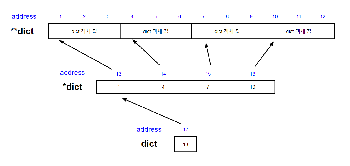 이 가변 배열 내의 주소를 참조하면(**dict) 해시 테이블 데이터에 접근할 수 있다.