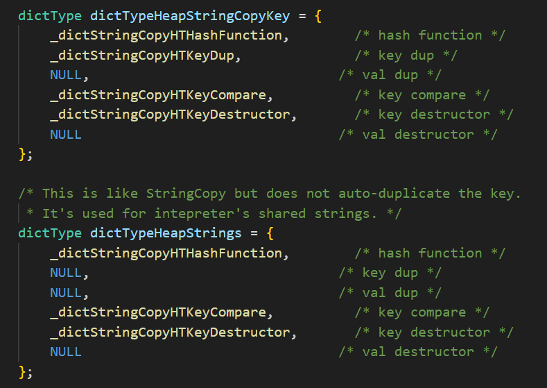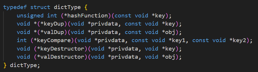 따라서 dict 객체에서 사전에 정의된 함수 포인터들을 저장해놓은 객체인 dictType을 사용한다.