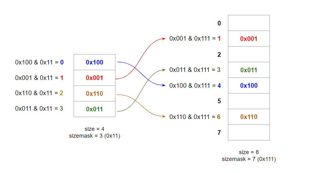 각 키의 해시 값과 새로운 해시 테이블의 sizemask를 & 연산해 새로운 인덱스를 결정한다.