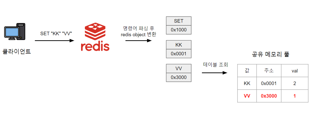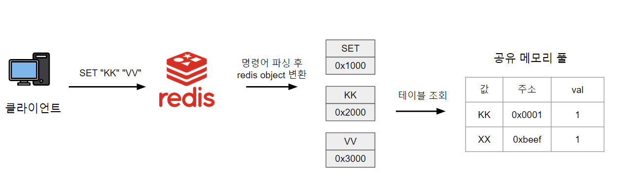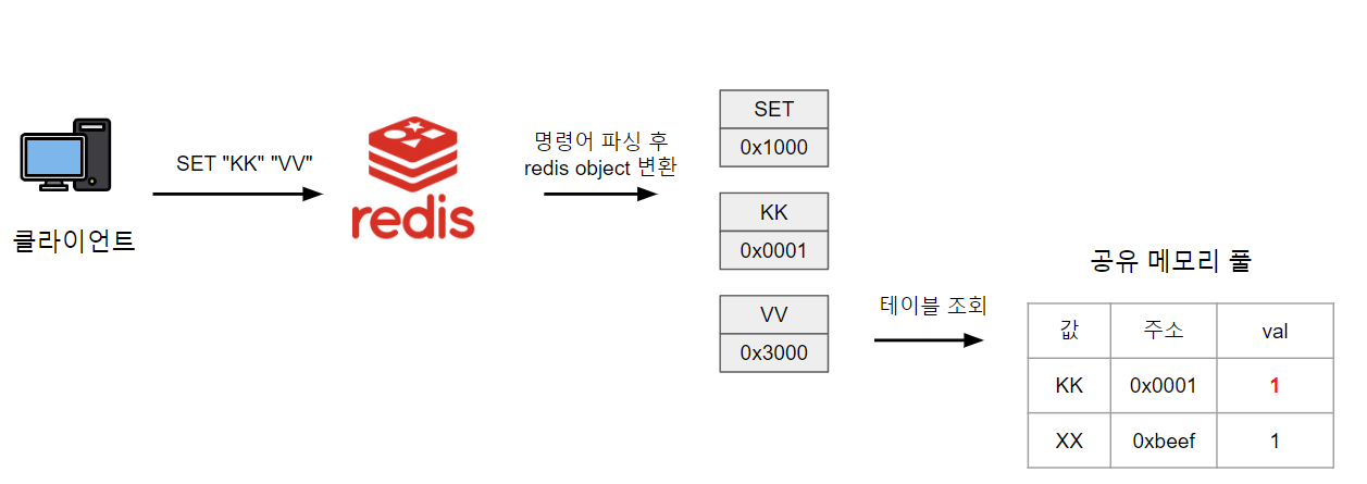 명령어를 입력받으면 명령어를 파싱해 redis object로 만들고, 공유 메모리 풀에 같은 값이 있는지 본다.