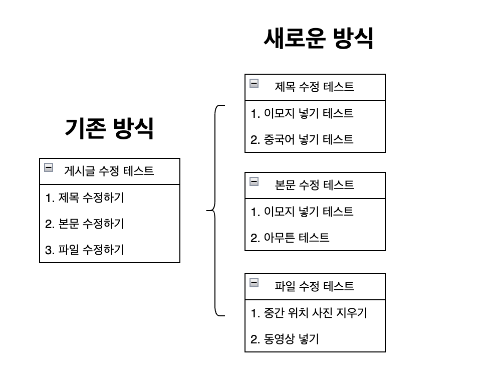 게시글 수정 테스트를 예로 들자면, 여러 메서드를 클래스로 변환하여 구조를 개선하였다.
