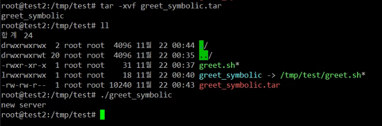 2. 서버 A에서 greet.sh를 가리키는 심볼릭 파일 greet_symbolic을 만들었다.