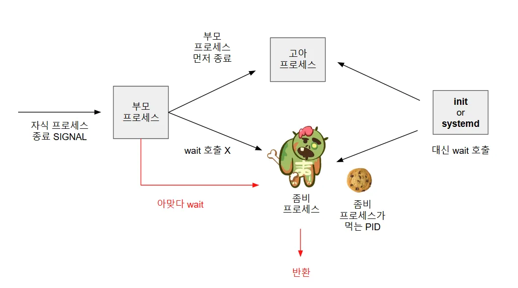 - 고아 프로세스: wait 호출 전 부모 프로세스 종료