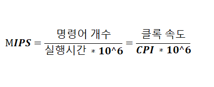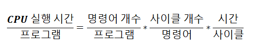 CPU 실행 시간 = 명령어 개수 * 평균 CPI * 사이클 시간 = 명령어 개수 * 평균 CPI / 클록 속도(사이클 시간 역수) |