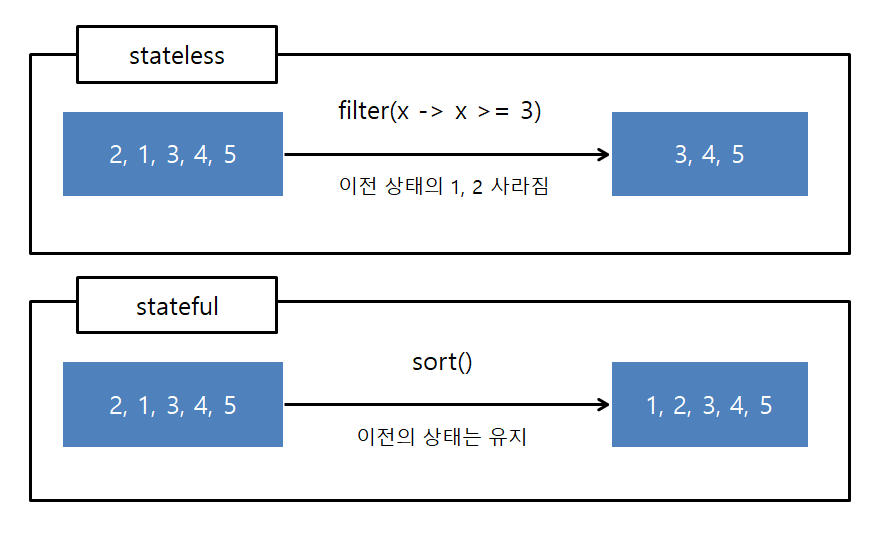 stateless의 경우 filter나 map 같이 이전의 상태를 유지하지 않는다.