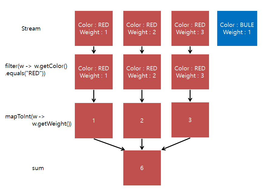 ex) 위 그림에서 filter를 거치게 되면 stream에서 color가 Blue인 객체는 빠진다.
